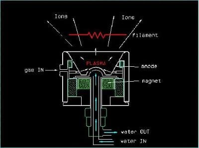 高いイオン生成効率とアノードの直接冷却方式により、室温に近い動作が可能。輻射熱による膜へのダメージやチャンバーの ガス放出が最小(他社製品例:500~1000℃ TELEMARK:70~80℃)